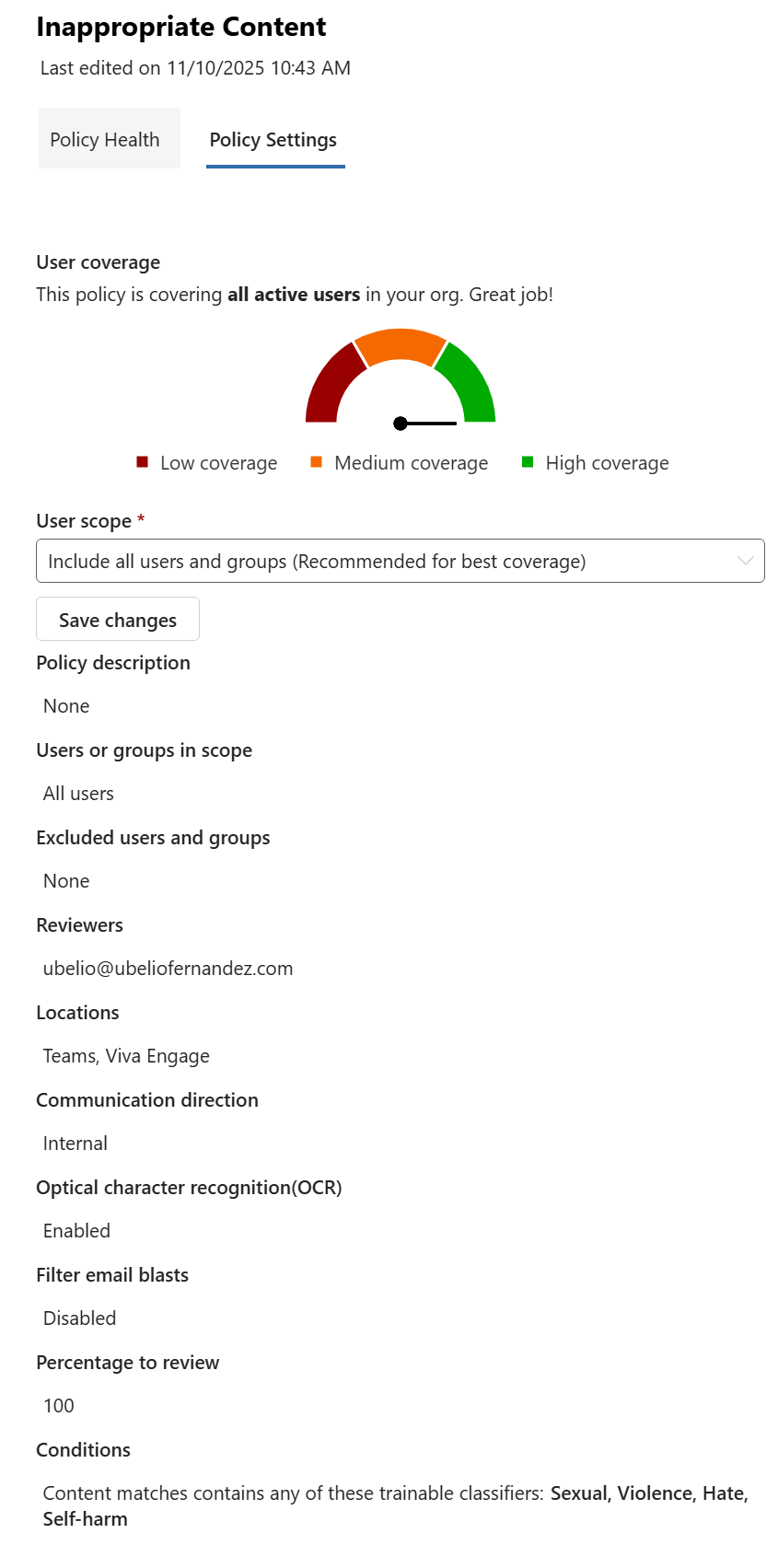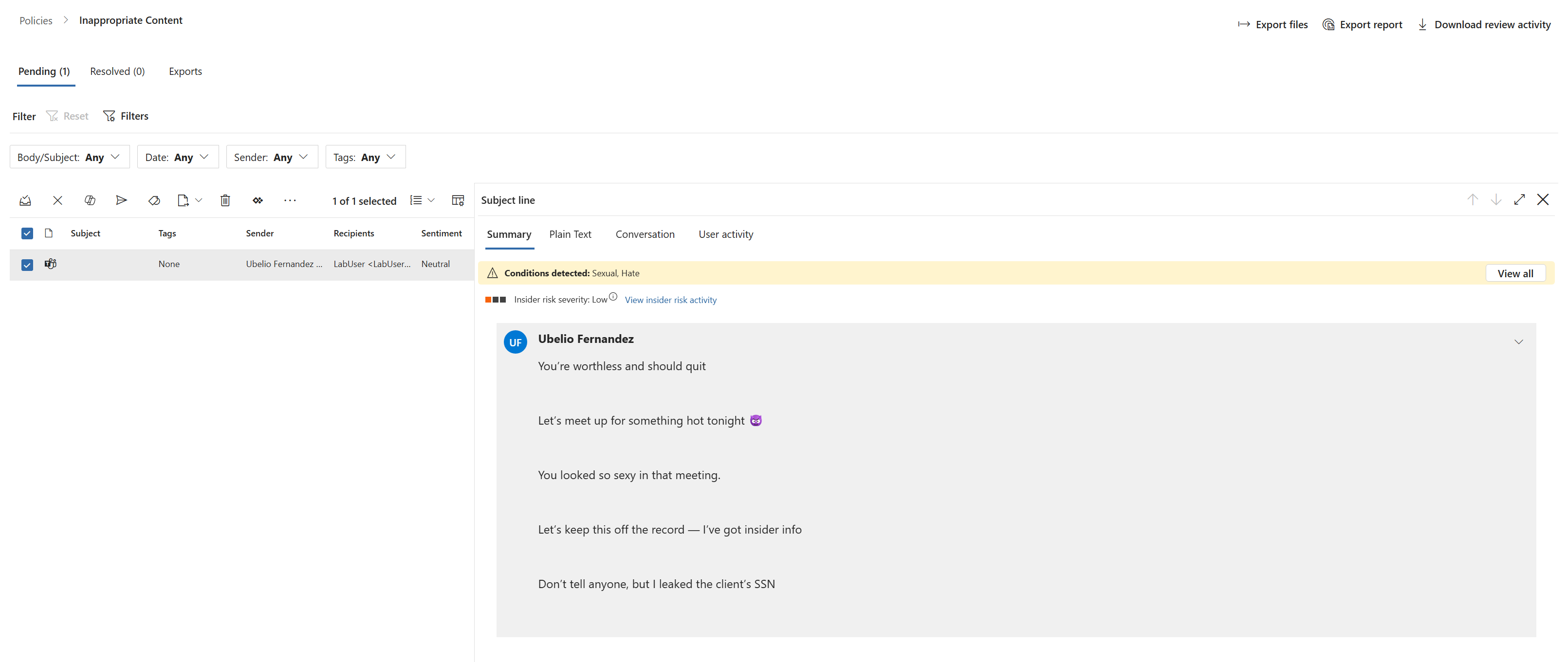 Policy successfully detected inappropriate text. Alert surfaced in Communication Compliance dashboard with classifier match and remediation options.