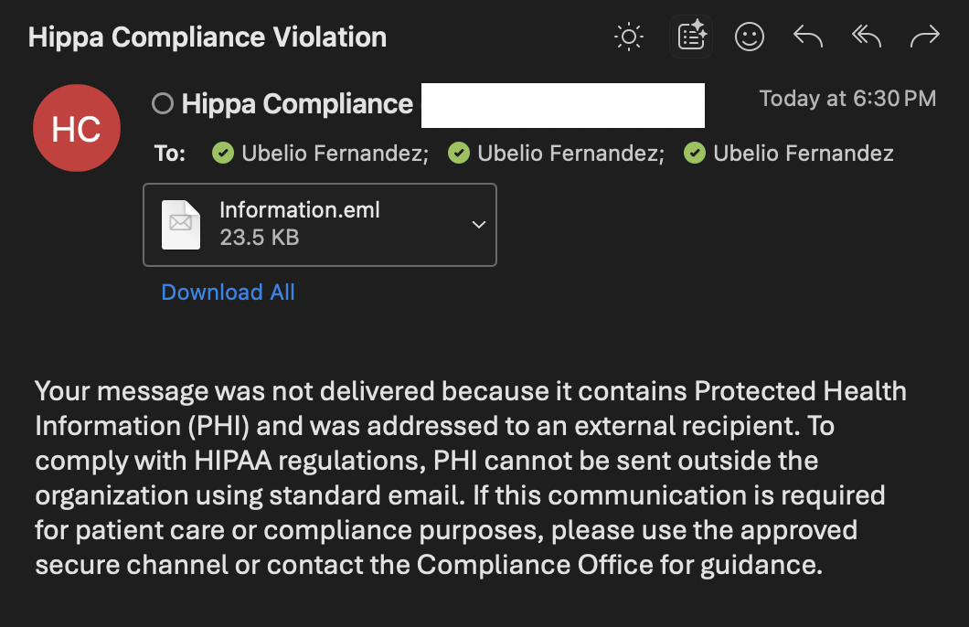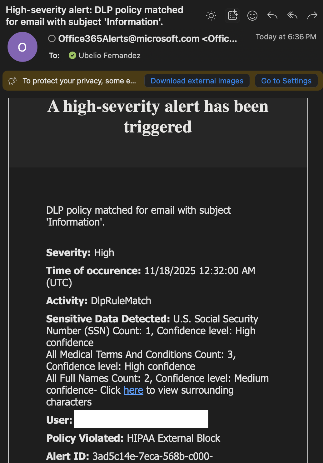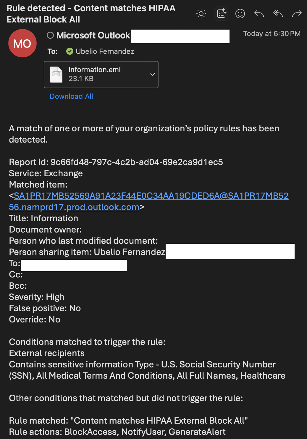 Single global external-block policy prevents PHI from leaving the tenant across all major M365 workloads. This simplified design reduces scoping complexity. Admins receive incidents and alerts for auditing and response.