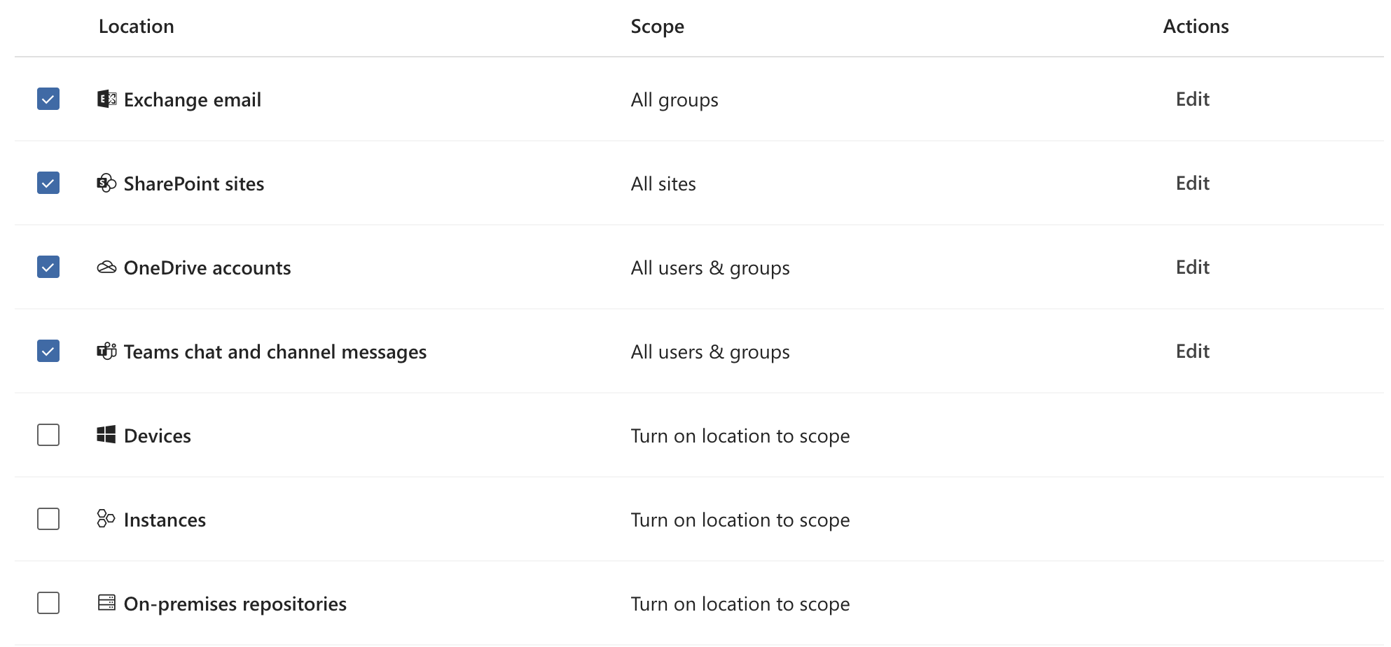 Choose specific locations and enable Exchange, SharePoint, OneDrive and Teams.