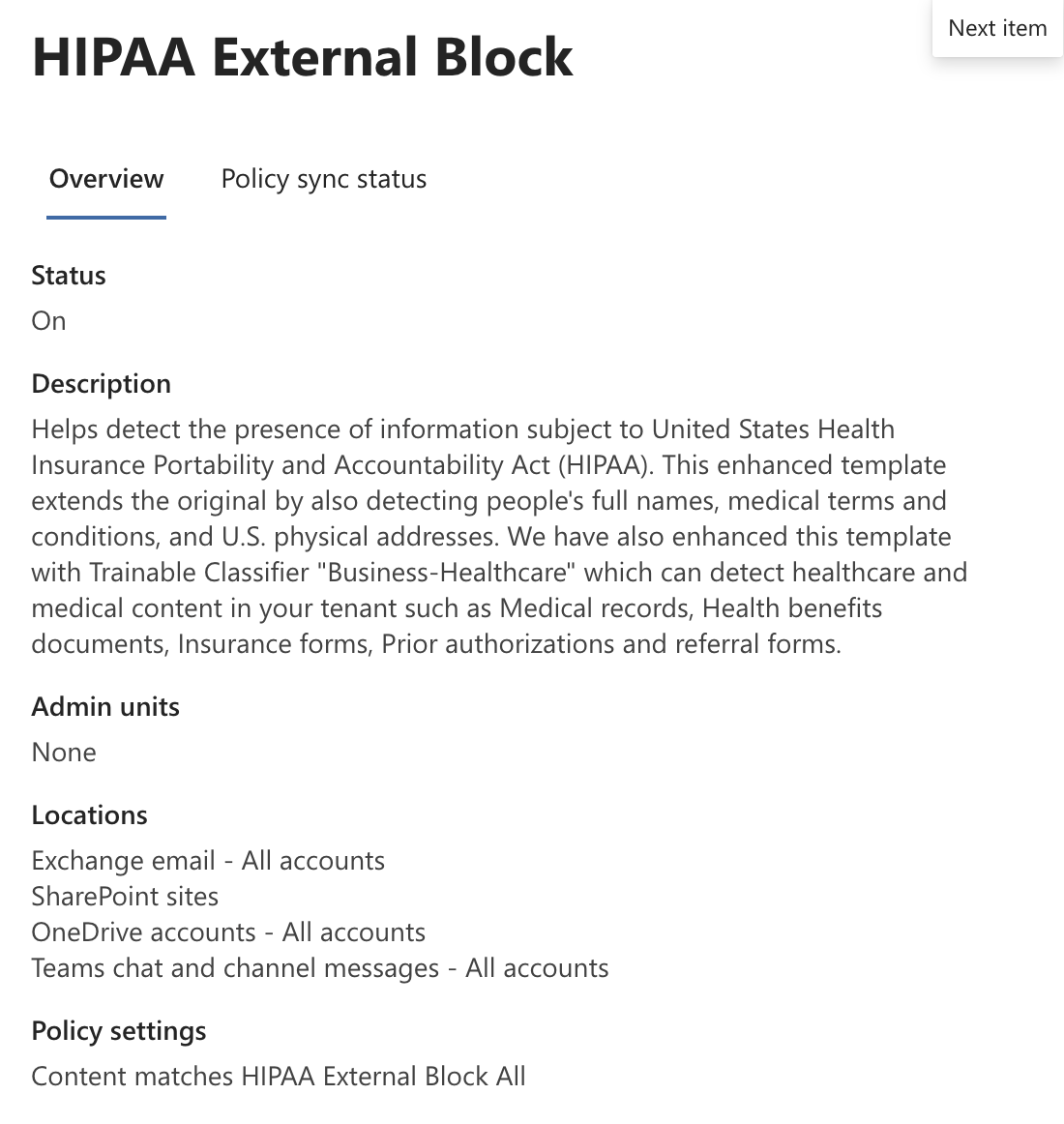 Name: HIPAA External Block β Global Locations: Select specific locations β Exchange mailboxes; SharePoint sites; OneDrive accounts; Teams chat and channel messages Users in scope: All users and groups (no exclusions in this lab) Condition: Contains HIPAA sensitive info types / classifiers Actions: Block external sharing/delivery; Show policy tip; Send user notification; Create incident/alert.