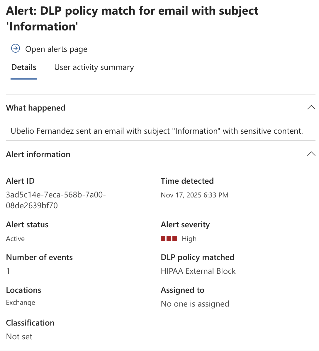 Purview alert view showing details of the policy match/blockAlert email where admin receives notifications about blocked external sharing and policy matchEmail notification to Admin showing policy match