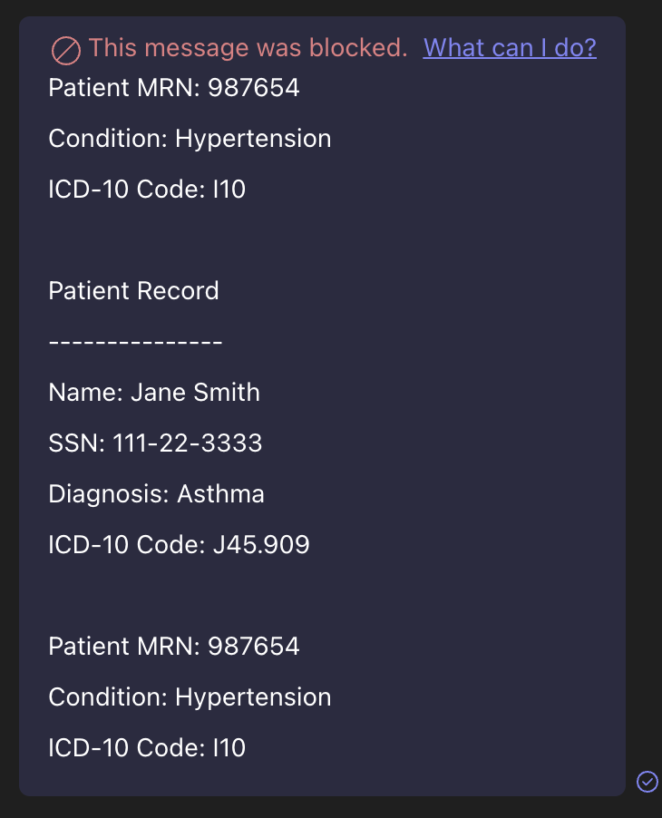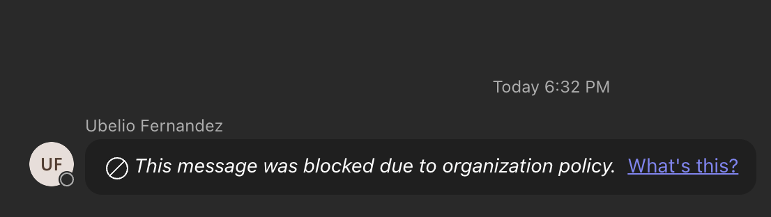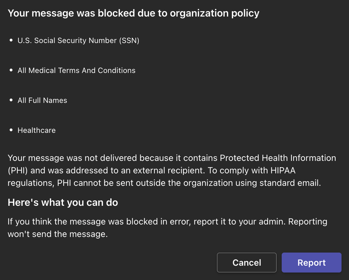 Policy tip displayed in Teams when trying to send PHI to an external guestPolicy tip displayed in Teams when trying to send PHI to an external guestReceiving chat example
