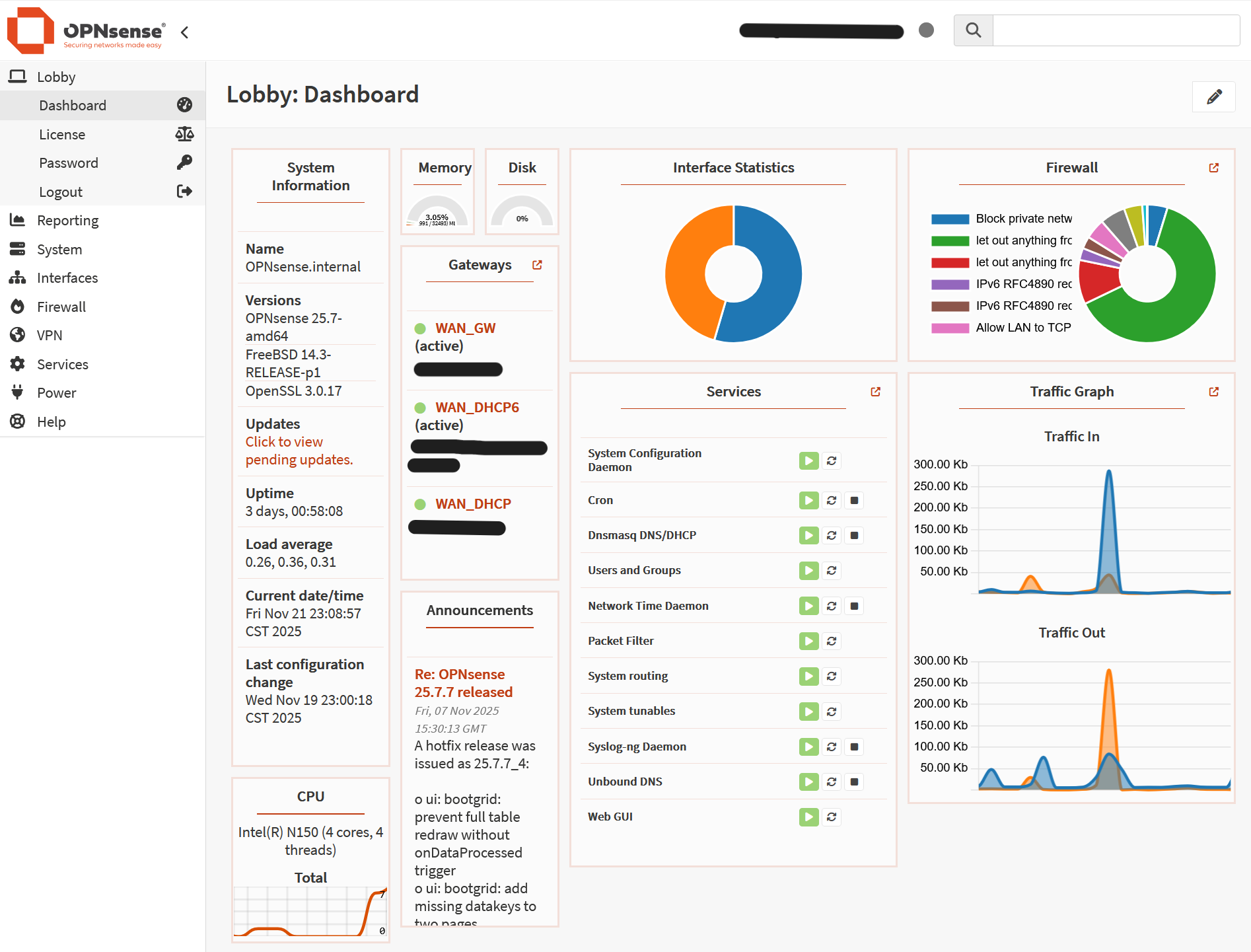 Firewall successfully deployed with secure administrative access. WAN/LAN connectivity validated, anti-lockout safeguards confirmed, and GUI restricted to LAN with optional 2FA. This establishes a hardened baseline for further configuration.