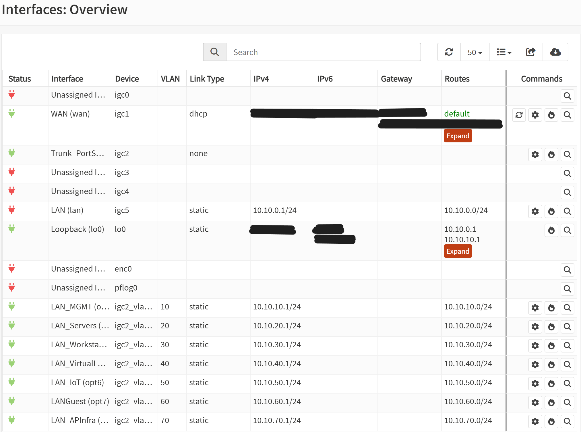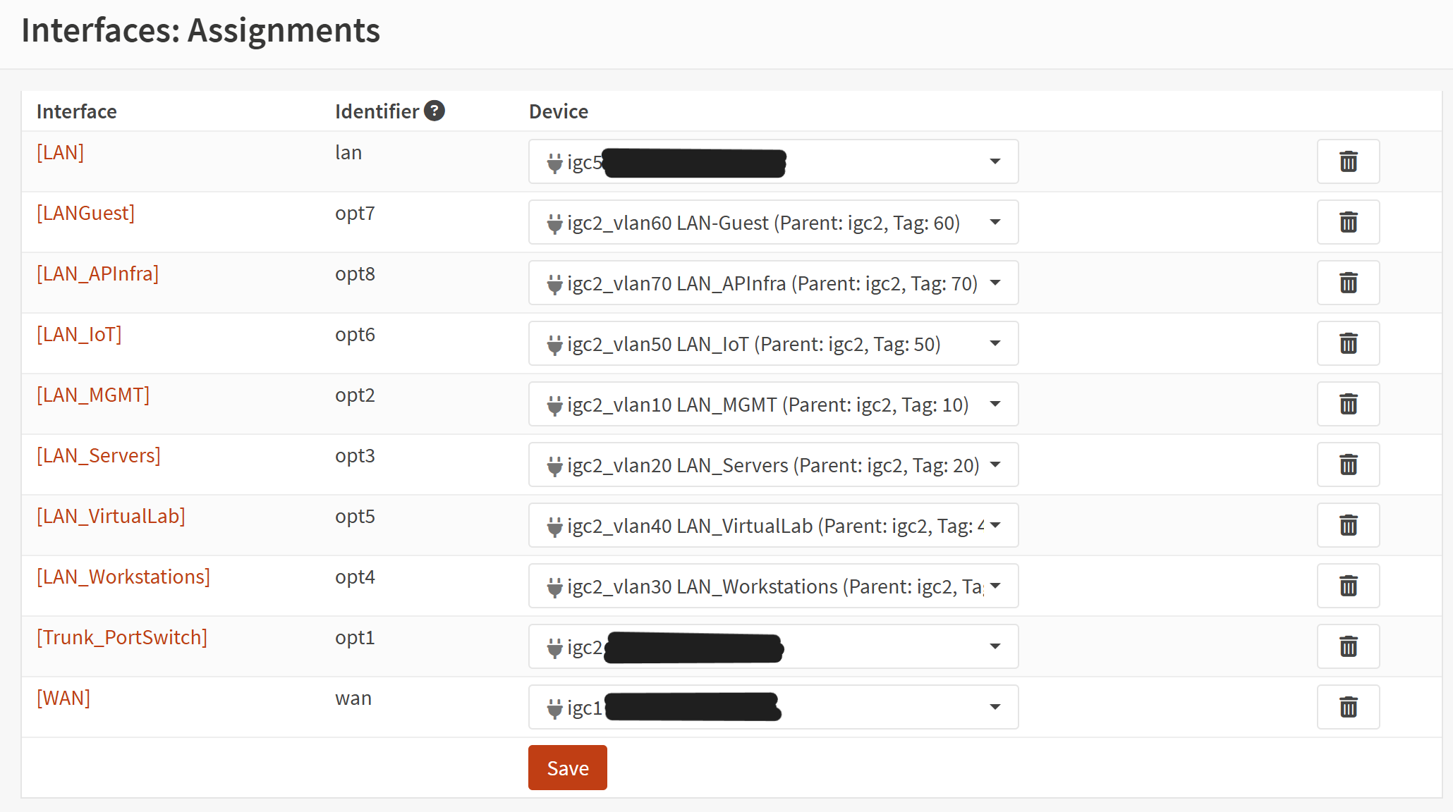 All VLAN interfaces are now active on OPNsense with correct IP assignments and verified operational status. This completes the firewall-side foundation for the segmented network created the switch config lab. With VLANs online and reachable, the next step will be configuring DHCP scopes for each network segment.